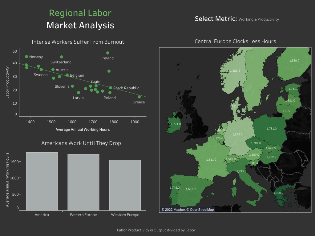 This project examined how payroll taxes impact willingness to work in various countries. I created a dynamic mathematical model in Excel and displayed the results in a professional, interactive dashboard using Tableau. Our team came to the conclusion that higher tax rates discourage working and account for roughly 25% of the difference between European and American working hours.